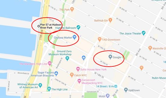 (三处红圈从左到右依次为:Pier 57码头、切尔西大楼、谷歌纽约办公楼,圣约翰码头在南边不远,又称40号码头)