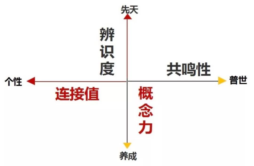 横轴左端是“个性”,每个企业家IP不同的风格,右端是普世,指人性中的最大交集。竖轴上端是“先天”,企业家IP先天具备的特点,竖轴右端为养成,即后天可培养的能力。延展出了四个象限,分别为:共鸣性、辨识度、价值感、概念力。