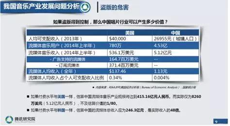 据腾讯研究院统计,2014年上半年中国流媒体音乐用户达到4.53亿人,流媒体音乐收入5.12亿元,全年流媒体人均消费1.13元,占当年城镇人口个人可支配收入的0.004%。