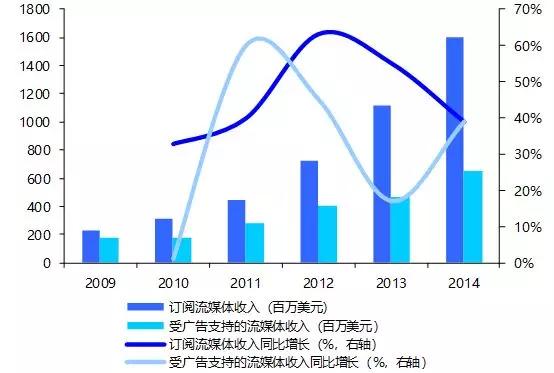付费订阅流媒体成为数字音乐增长的主要推动力。根据IFPI数据,2014年流媒体收入占全球数字音乐总收入的32%。其中,受广告支持的流媒体收入占9%,同比增长38.6%;订阅流媒体收入占23%,同比增长39%,订阅服务用户数达到4100万人次。2016年订阅流媒体收入增速达到60.4%,成为数字音乐产值的主要增长点。