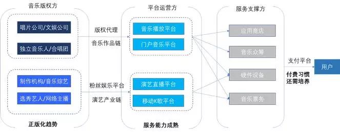 从整体来看,数字音乐产业链分为版权提供方,平台运营方和服务支持方。