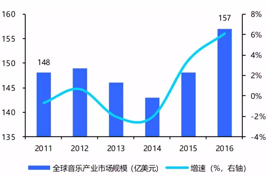 根据IFPI数据,2016年全球音乐市场整体规模达到157亿美元,同比增长5.9%,实现自1997年以来最大的行业增幅。