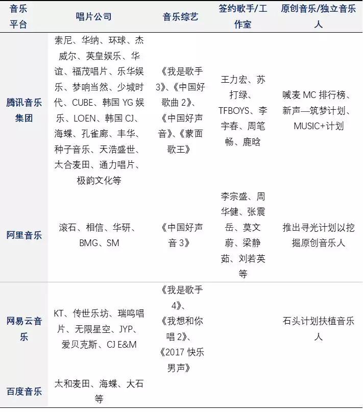上游版权方拥有大量版权资源,包括唱片公司,独立音乐人,音乐综艺和网络主播。