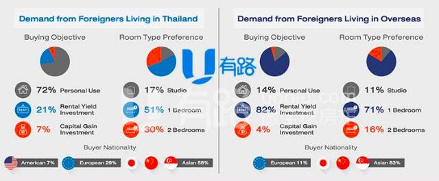 泰国作为近年来东南亚新兴市场炙手可热的房产投资市场,从2012年到2017年短短的五年时间内,外国买家的需求激增了700%。数据显示,泰国房地产市场的买家主要来自亚洲地区,例如中国香港、新加坡、马来西亚、中国大陆、日本和中国台湾,占比约 83%,欧洲买家约占 11%。