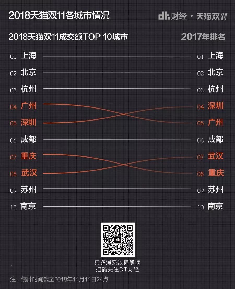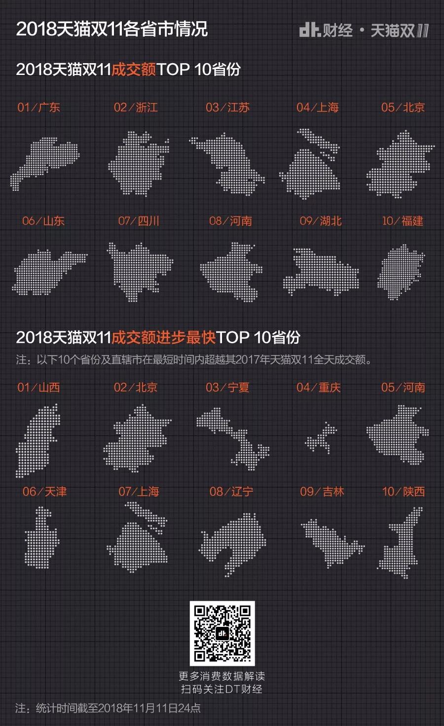 不过,今年最亮眼的地域榜单可能还是来自在买买买的道路上进步飞快的十个大省——它们以最快的速度实现了对2017年全天成交额的超越。除了北京、重庆、上海和河南,上榜的其他省市都属于名副其实的剁手新生代。山西省只用了半天时间就超越了自我,成为全国进步最快的省份。也许再过几年,总成交额TOP省份前列稳如泰山的格局就会在新生代们的追赶下发生变化了呢。