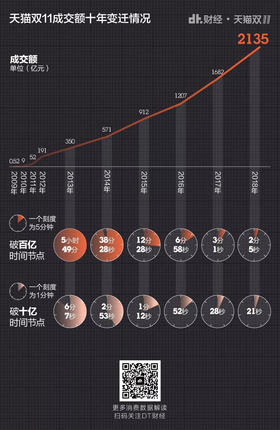 从2009年走到2018年,双11的成交额也从5200万元来到2135亿元,每一年破记录的速度都表明,大家剁手的疯狂总是超出想象。