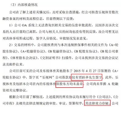 今年7月9日,乐视网发布的一则公告还表示,公司针对乐视体育融资时承诺的回购责任等相关事项,未履行符合《公司法》《公司章程》及相关法律法规规定的审批、审议、签署程序,其法律效力存疑。