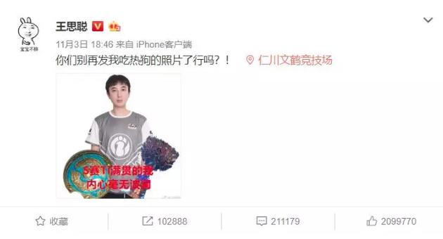 上周六(11月3日),“iG夺得英雄联盟S8冠军”的消息刷屏,战队老板王思聪一张吃热狗的照片也随之走红,甚至衍生出大量“吃热狗”的表情包、文化衫、手机壳……