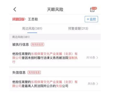 至少天眼查信息显示,由于担任乐视体育的高管,他的风险词条里多了16条被执行信息和5条失信信息——有且仅有这21条“高风险信息”。