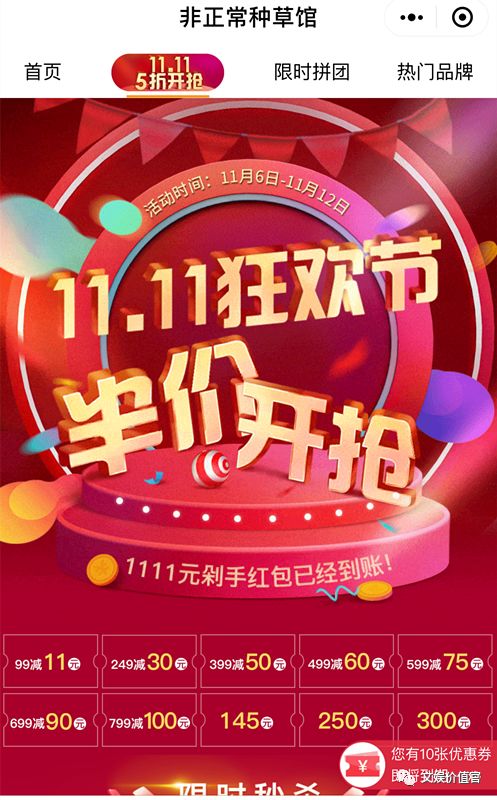 咪蒙的“非正常种草馆”小程序一登录,双11的红包率先映入眼帘,这里也是最接近某宝气质的自媒体电商,直白的商业化页面里,面膜、唇膏、防晒、减肥药……品类无不聚焦女性消费市场。