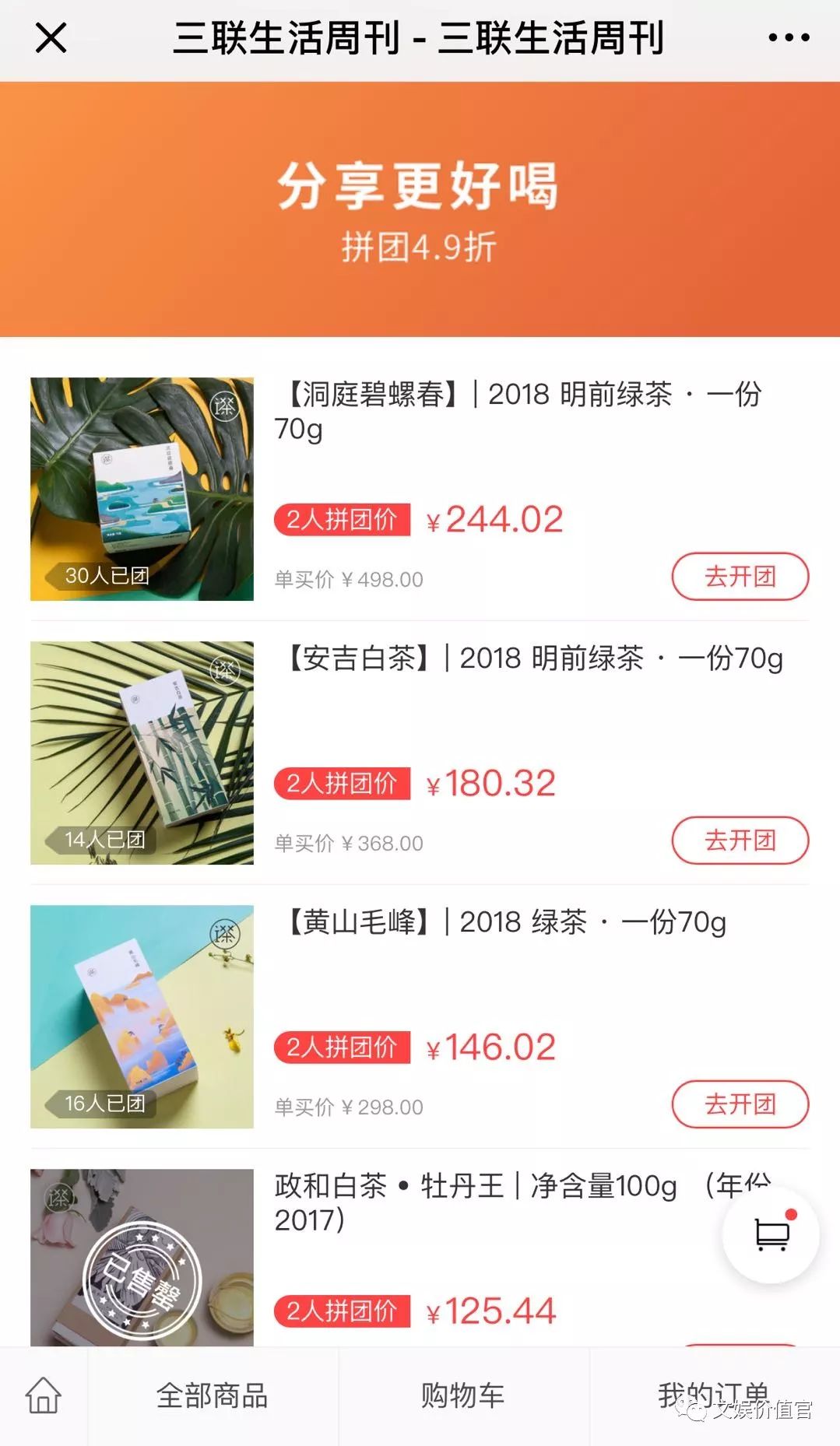 选产品是三联电商试水的第一项任务,可想而知,后台庞大的数据里做画像分析和脸谱观察后,一张张戴着眼镜、不苟言笑、奋笔疾书的脸向前一步走。那么,他们会为什么买单?针对高知人群精准需求得出的结论,就是茶叶了。虽然售卖页面没有公开的销售数据,但价值官身边还是有购买过三联茶叶的消费者,概率已经很高了。因此,三联卖茶,至少在市场定位上是准确的。