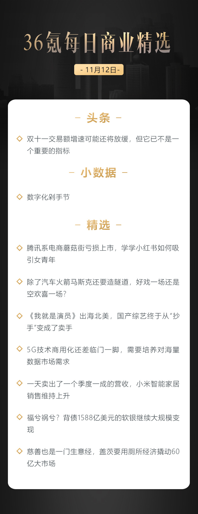 本文来自36氪付费栏目《36氪每日商业精选》——11月12日