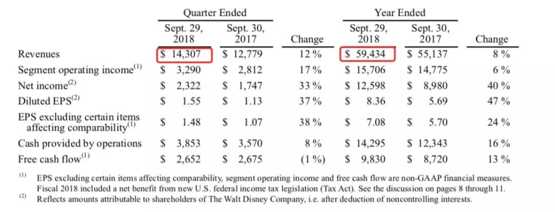 同一天,迪士尼对外发布了2018财年第四季度及全年财报,数据显示,截至2018年9月29日,迪士尼2018财年第四季度营收为143.07亿美元,净利润为23.22亿美元,同比增长33%,除去其他可比性影响因素后,第四季度的稀释每股收益(EPS)比去年同期增长38%。2018财年全年营业收入594.34亿美元,净利润为125.98亿美元,同比上涨40%,EPS同比增长24%。