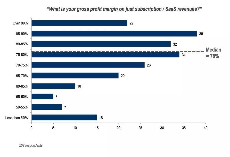 绝大多数国外成功的SaaS公司的毛利水平在60%~85%之间。CRM鼻祖Salesforce在过去5年的平均毛利水平约74.6%。MDM的大佬厂商MobileIron的毛利水平是81%,通信API厂商Twillio在2015年的毛利水平约为55.69%。春阳曾经分享过的“藏宝图”报告里有过一个关于209家SaaS厂商毛利水平的统计,如下图所示,其中位数是78%。