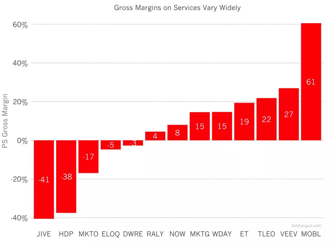 横轴是13家上市SaaS公司的代码,大部分应该在能看的出来。竖轴是专业服务(Professional Service,比如咨询培训和需求定制化)带来的毛利。其中5家公司做了这个事情其实是亏的,除了研发协作SaaS Jive的-40%比较辣眼睛以外,其余的亏损相对比较柔和。而靠这个服务签更大合同、赚更多钱的公司就比较实在了,多个20%左右毛利是肉眼可见的福利。