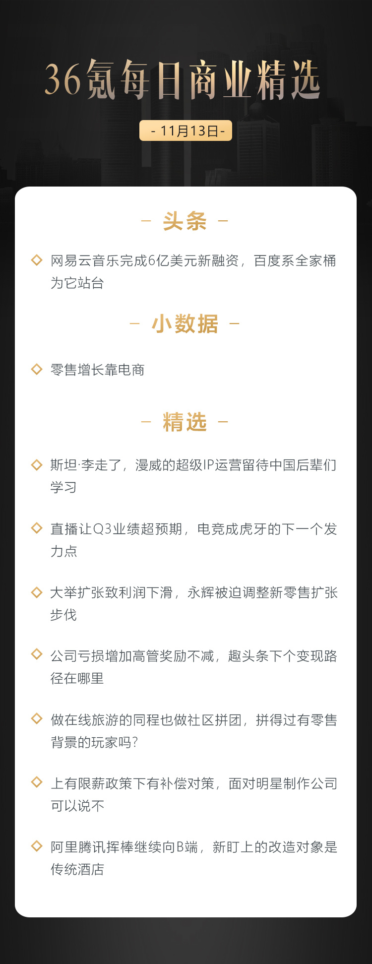 本文来自36氪付费栏目《36氪每日商业精选》——11月13日