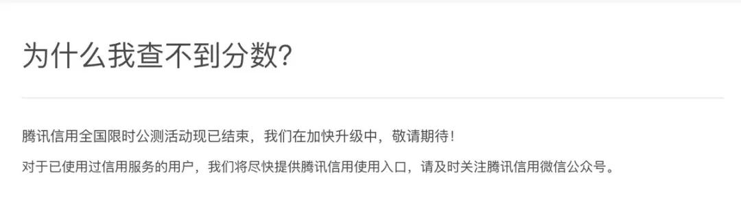 今年 1 月 30 日,腾讯信用宣布在全国开放公测,但持续时间仅有一天,据《财新》报道,腾讯信用分是因无征信牌照而被央行叫停。