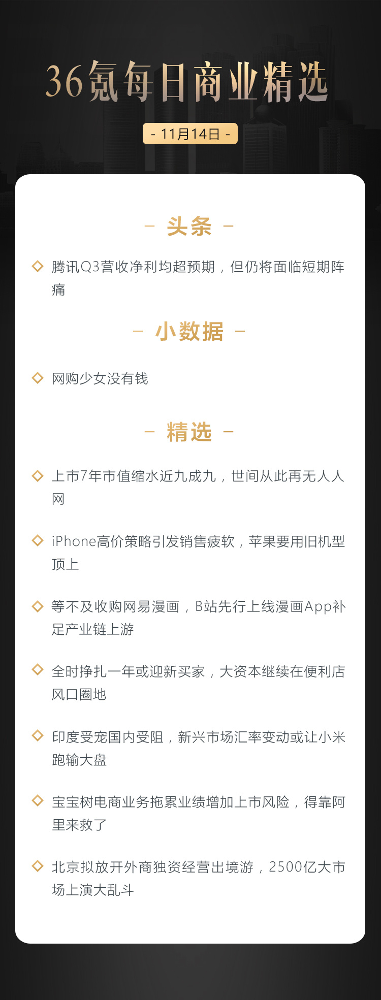 本文来自36氪付费栏目《36氪每日商业精选》——11月14日