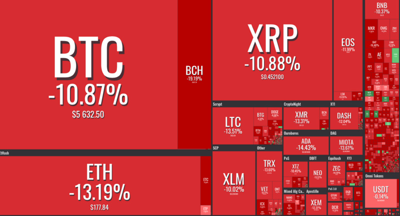 截至发稿前,据 coinmarketcap 数据,BTC 目前报价 5653 美元,跌幅达 10.94%,加密货币总市值约 1851 亿美元。