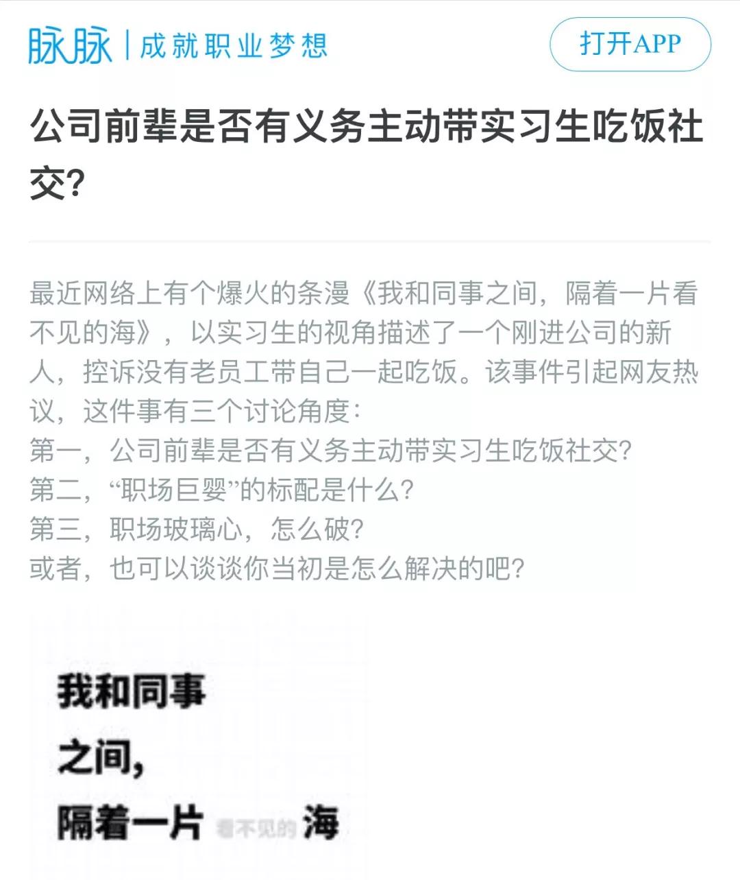 脉脉实名问答区的一个热门帖子,专门针对这事发起了讨论,话题是这样的:公司前辈,是否有义务主动带实习生吃饭社交?