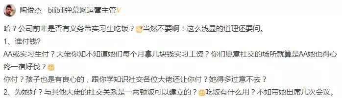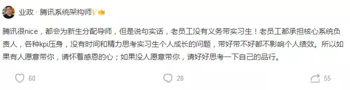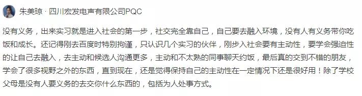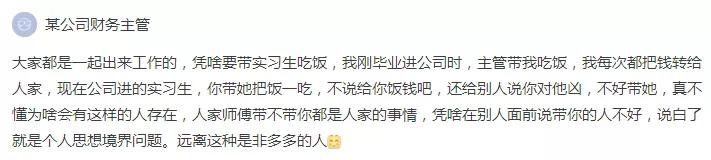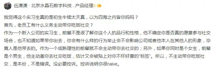 脉友们的回复五花八门,有的想起了自己初入职场时热情的前辈,有的自信自己就是那个善良的导师,但普遍观点是,带实习生吃饭社交,并不是公司前辈的义务。