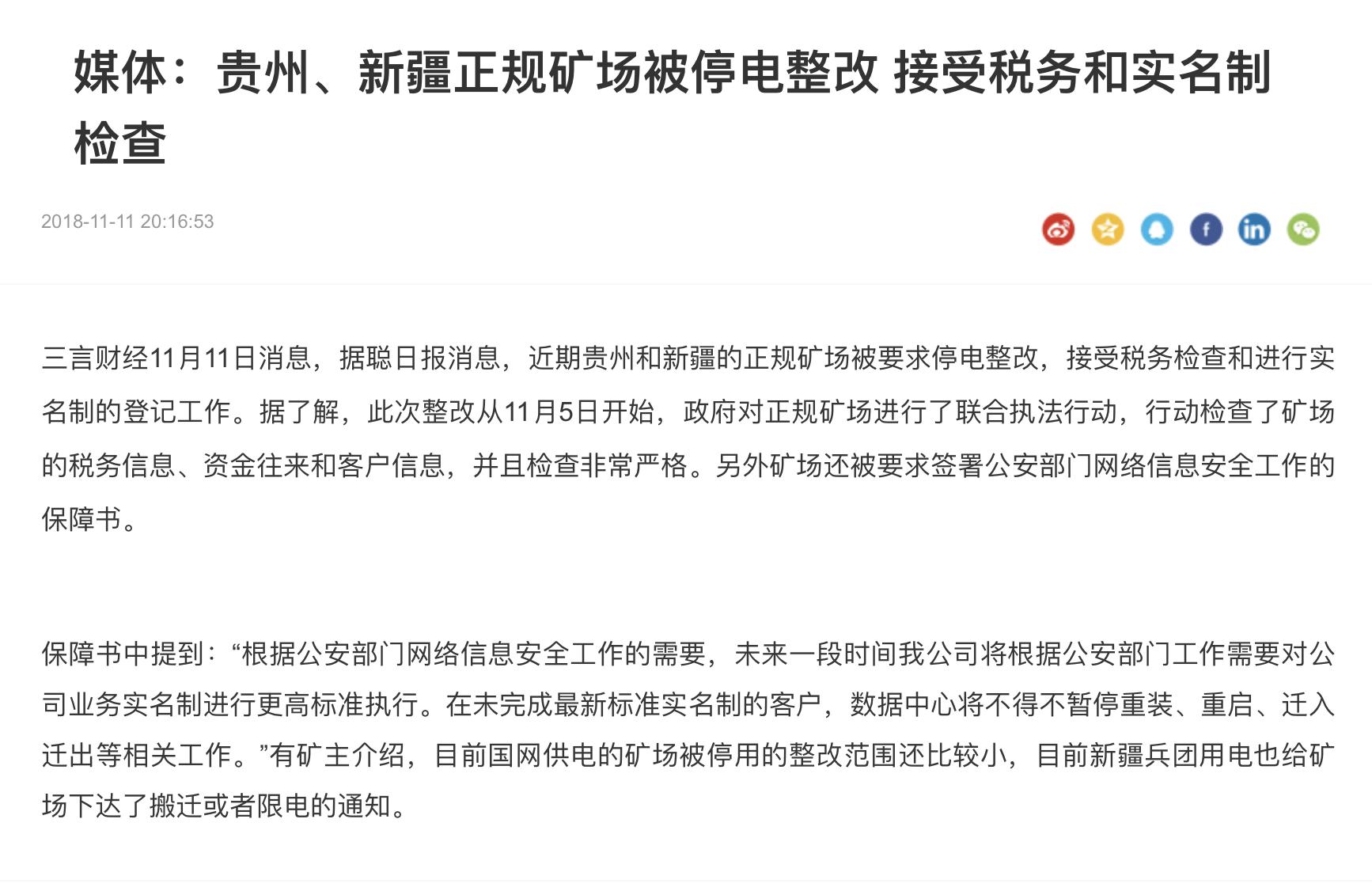 在比特大陆、嘉楠耘智和亿邦国际招股书中,均提到此方面风险。今年11月11日,贵州和新疆相关部门就对矿机商进行了严格检查,要求停业整改。据悉,本次检查非常严格,行动检查了矿场的税务信息、资金往来和客户信息。另外矿场还被要求签署公安部门网络信息安全工作的保障书。