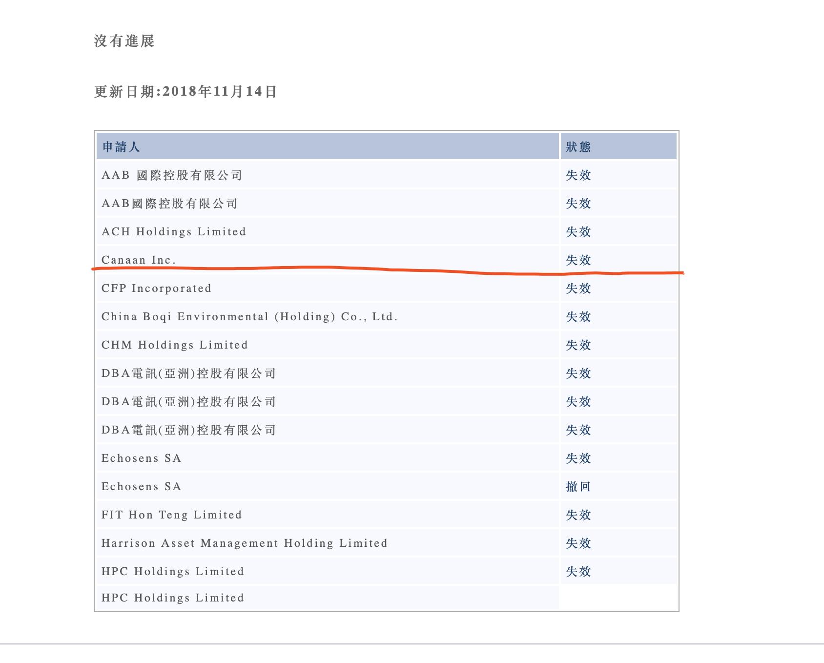 然而,今天,三言君在港交所官网查到,第一个向港交所递交招股书的嘉楠耘智已经被列在“失效”一栏中。
