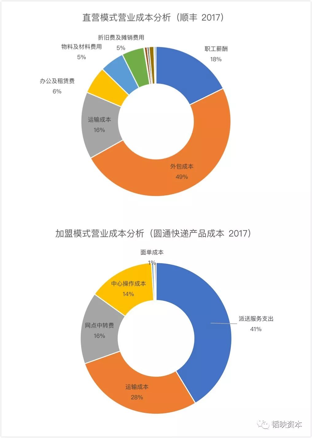 快递小哥和网点运营都是自己人,虽然控制力加强了,但随之而来的却是更高的人力成本和相对较慢的扩张速度。从顺丰和圆通的营业成本结构可以明显看出,直营模式的顺丰2017年职工薪酬和外包成本两项人力成本占比高达67%;而加盟模式的圆通则以派送服务、运输成本、中转成本为主。