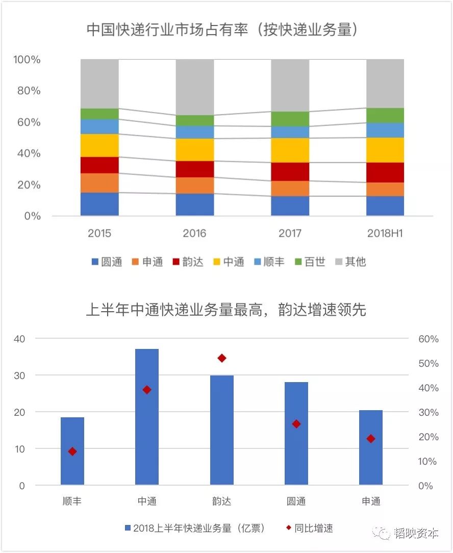 2016年以来,中通超过圆通成为中国业务量最大的快递公司,今年上半年中通的市场占有率达到16.1%;韵达也保持着高速增长,上半年业务量大涨52%,市占率也从2016年的10.3%涨到上半年的12.7%;而顺丰由于采用直营模式扩张成本高、速度慢,再加上更加注重服务和时效的高端定价策略,上半年业务量占比仅为9.2%。