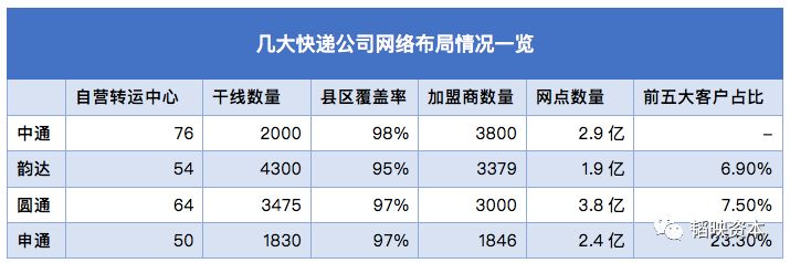对比各家的网络布局,可以说是各有千秋。中通的自有转运中心数量最多,县区覆盖率略高于其他三家;圆通的网点数量最多,韵达的干线数量和加盟商数量领先;申通主要与较大企业合作,前五大客户占比最高。
