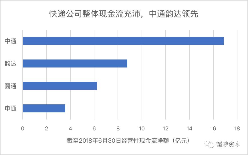 截至2018年6月30日的经营性现金流来看,各大快递公司整体现金流都不错,中通、韵达更为充沛。