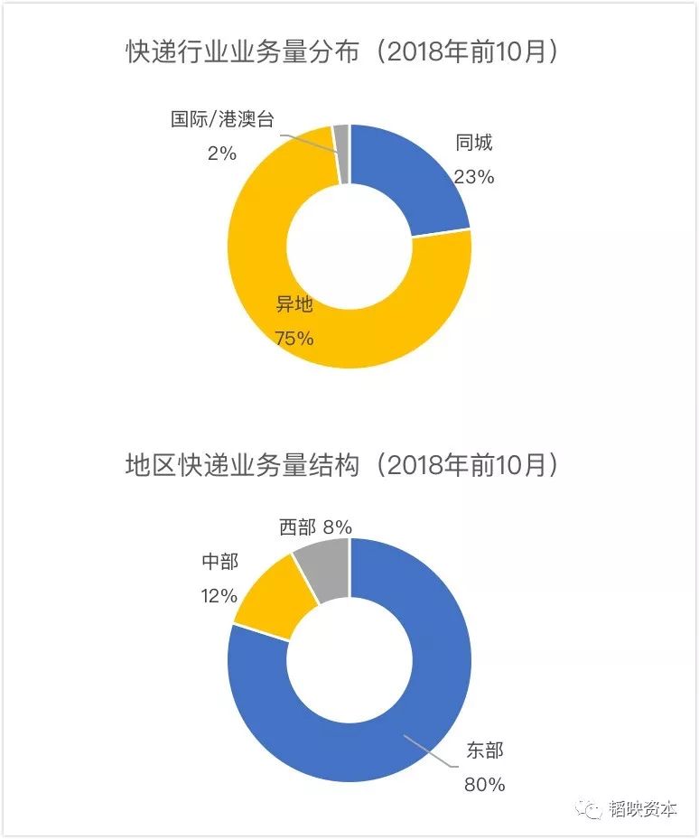 从今年前10个月的数据来看,快递业务仍以异地为主,占据了75%的业务量;同城和跨境(国际/港澳台)分布占比22.7%和2.3%。按地域来看,受到经济发展水平和电商渗透率等因素影响,东部地区占快递业务量比例接近80%。