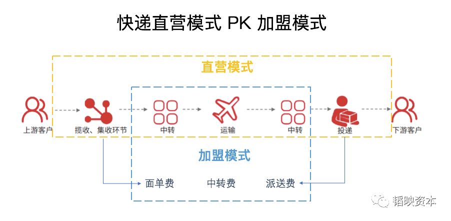 从消费者的角度来说,快递服务主要包括揽收、中转、运输和派送等四个环节。简单来说,直营模式的快递公司就是将这四个环节都揽入麾下,自行运营并赚取全部收入;而加盟模式的快递公司只将中转和运输自行运营,揽收和派送两个环节则交给加盟商,并赚取面单费、中转费、派送费等收入。