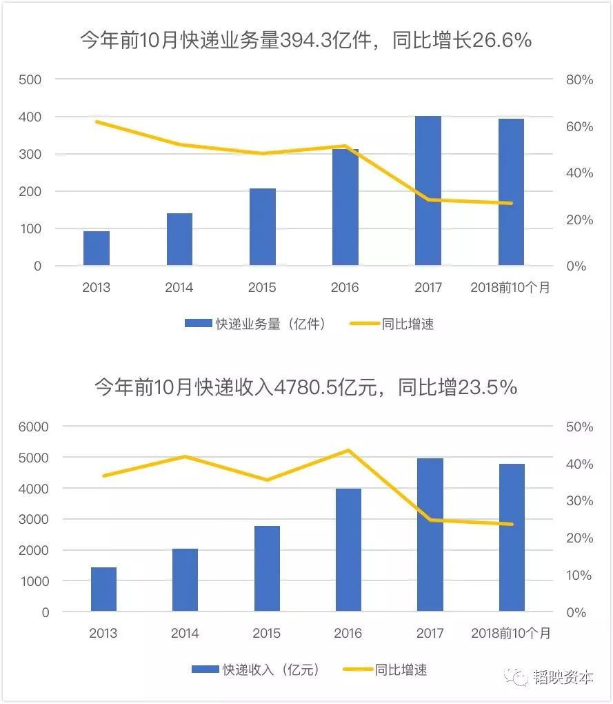 近年来,随着电商渗透率不断提升,快递行业迎来高速发展,业务量和收入逐年攀升。国家邮政局数据显示,今年前10个月快递业务量394.3亿件,同比增长26.6%;快递收入4780.5亿元,同比增长23.5%。但需要注意的是,2017年以来,业务量和收入增速都开始下滑。