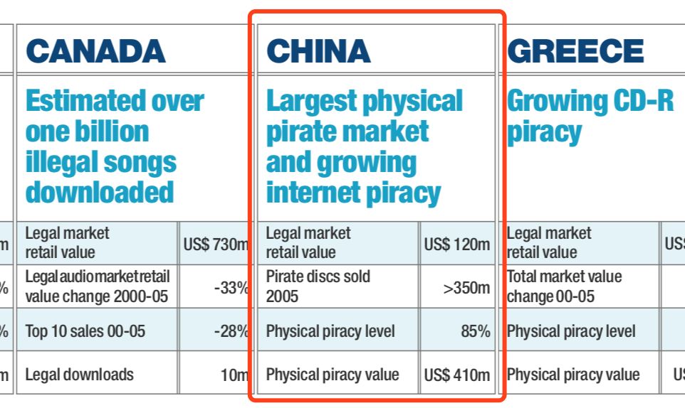 上文提到,在2005年,中国是“全球最大的实体音乐盗版市场”,85%的音乐产品是盗版。