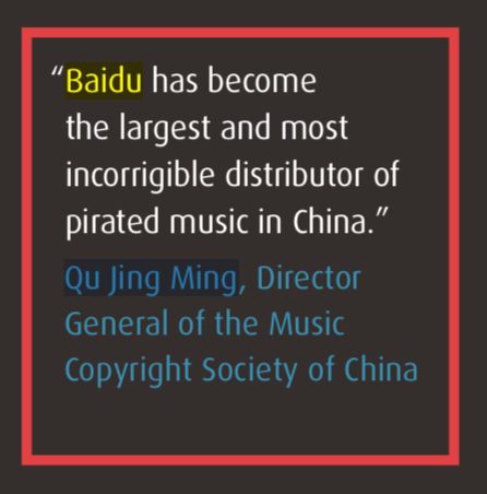 2009年的《数字音乐报告》中,IFPI援引时任中国音乐著作权协会总干事屈景明的话说:百度已经成为中国最大的和最顽固的盗版音乐散布者。