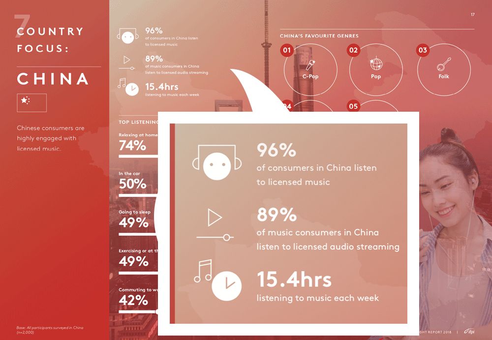 图中数据直译过来是:96%的中国消费者听正版授权音乐,89%的音乐消费者听正版授权音频流媒体,受访者每周听音乐时间是15.4小时。