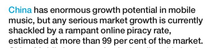 翻译:中国在移动音乐上具有巨大的市场潜力,但任何市场成长都被肆虐的在线盗版率所桎梏,市场上的盗版比率超过99%。