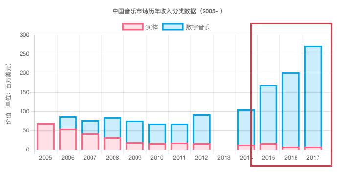 数据上看也是如此:2015年起,数字音乐市场开始高速增长。2015年,中国数字音乐收入的增长量相当于2011年全年的水平。