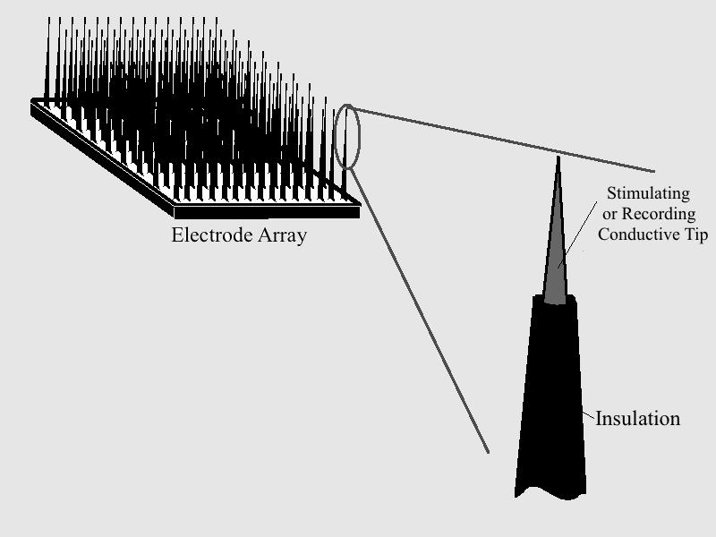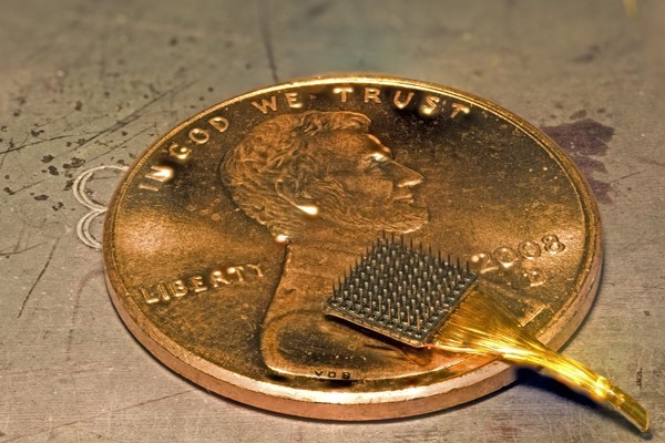 办法之一是将一个多电极阵列植入到头骨下方。这种做法听起来似乎很恐怖,但其实已经实现了。上图中电极的小针记录着大脑生成的信号,然后被发送给机器接口进行解码。