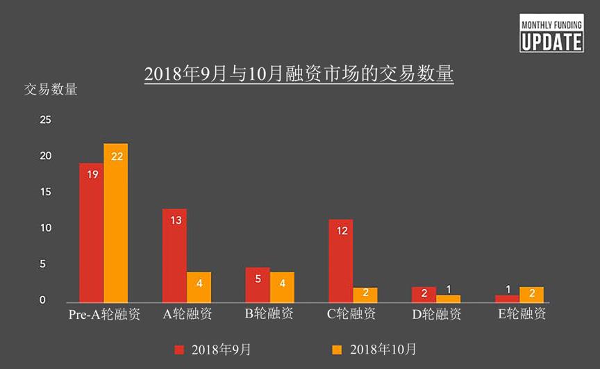 10月的融资市场略显沉闷,51笔交易的融资仅达到7.1413亿美元,只是去年10月融资金额的50%,比今年9月融资额的1/4略高出一点。倘若10亿美元以上的大型投融资缺席的话,2018年的融资市场能否赶超2017年137亿美元的创纪录规模?