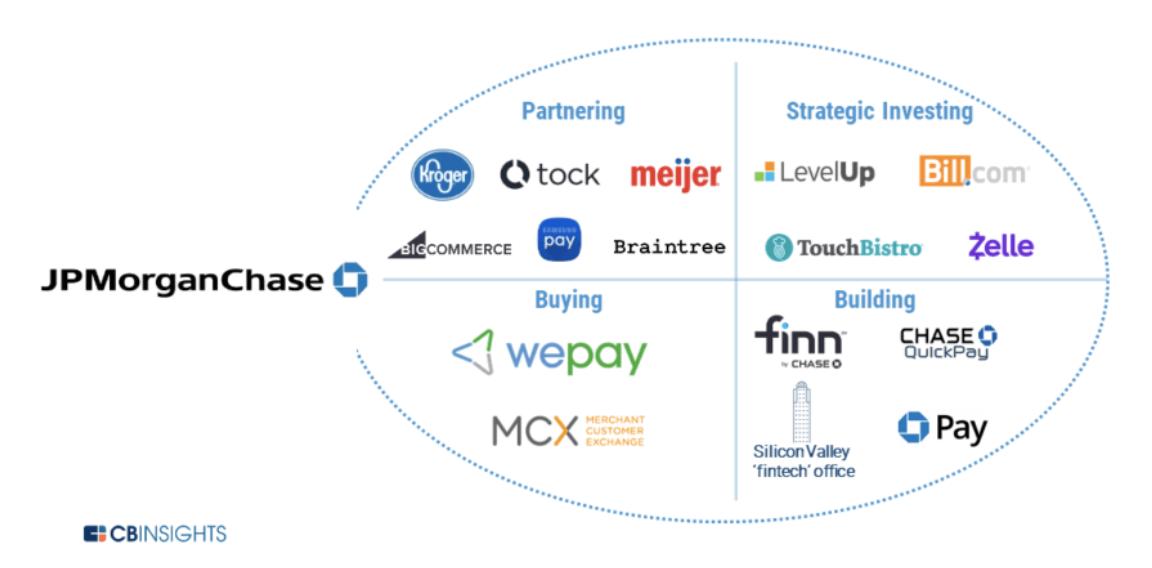 投资:策略性地投资支付公司,以此增加交易量。这些投资还允许摩根大通将外部解决方案与现有服务整合起来,协同发展。例如,摩根大通投资了餐厅支付项目LevelUp,然后将LevelUp的预订软件整合到Chase Pay中。
