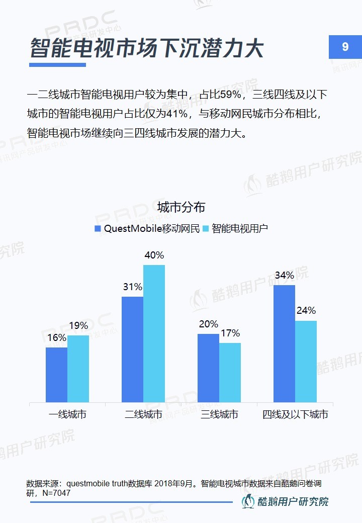 智能电视用户在一二线城市的占比较高,三线及以下城市智能电视用户占比低于移动网民的分布,三线以下城市智能电视市场的拓展潜力大。