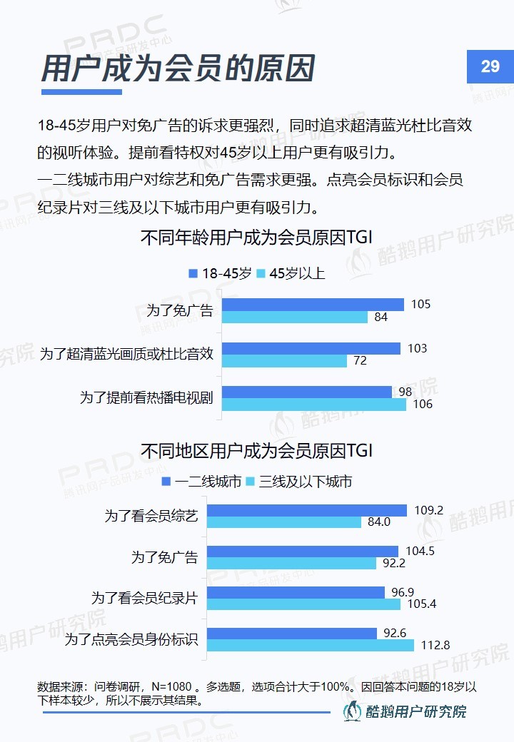 年轻用户在功能体验上更愿意尝鲜,在品牌上更倾向继续使用移动端的APP品牌,在内容上对独播内容需求强,为了独播内容、免广告和蓝光杜比音效等特权购买会员比例高。不同会员特权对用户的吸引力存在代际和地区差异。针对不同年龄和地区用户进行差异化的运营,是提升会员数量的必经之路。