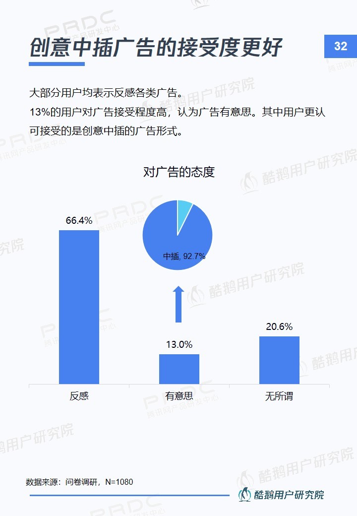 用户对各类广告均比较反感,但新颖的创意中插广告接受度要好于传统的前贴广告。结合智能电视使用场景和观看者属性的新颖广告形态,能够有效提升用户体验,丰富智能电视的商业生态。