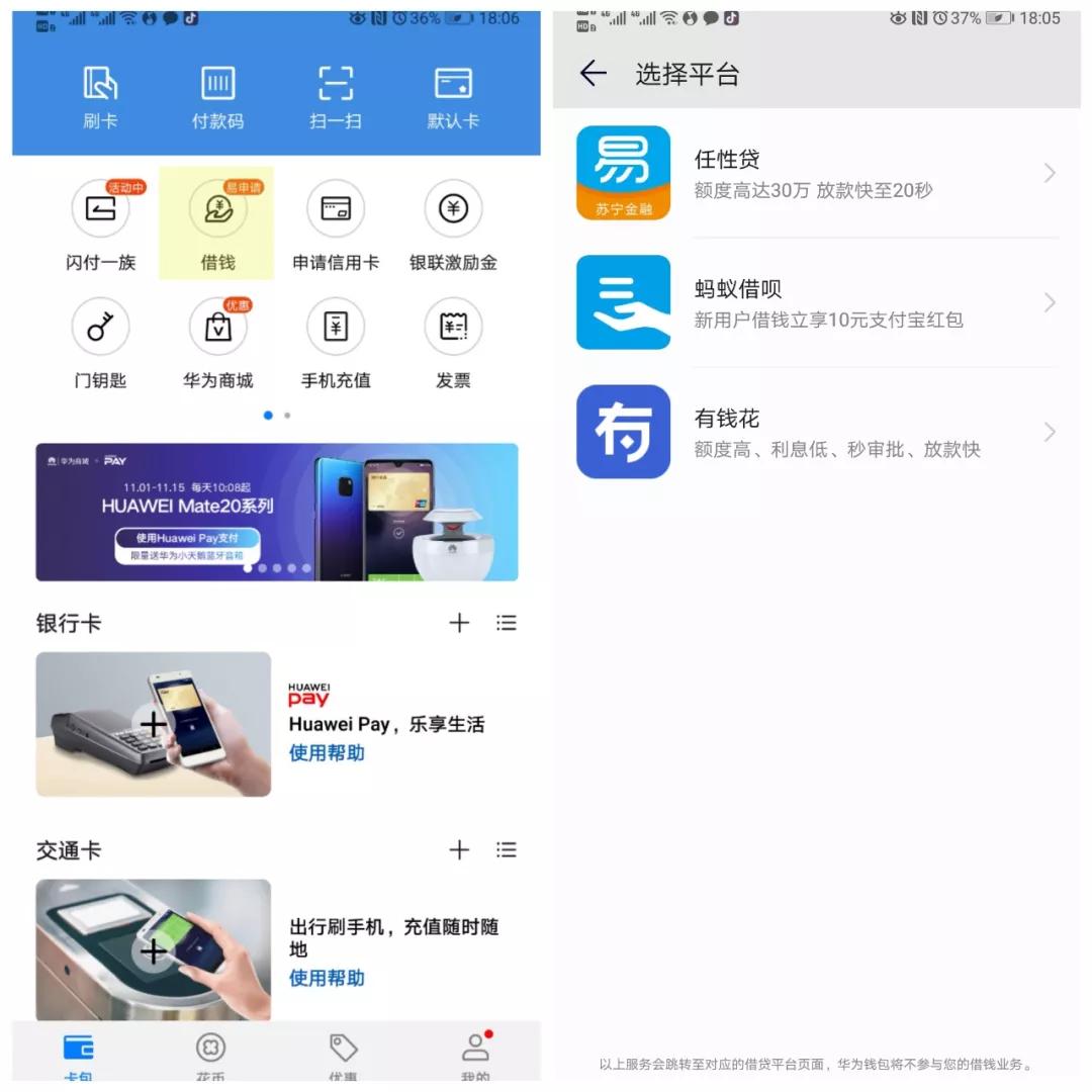 华为手机“钱包”应用“借钱”栏目里,目前正为三款信贷产品导流,蚂蚁借呗就在其中。另外两款是百度有钱花、苏宁任性贷。