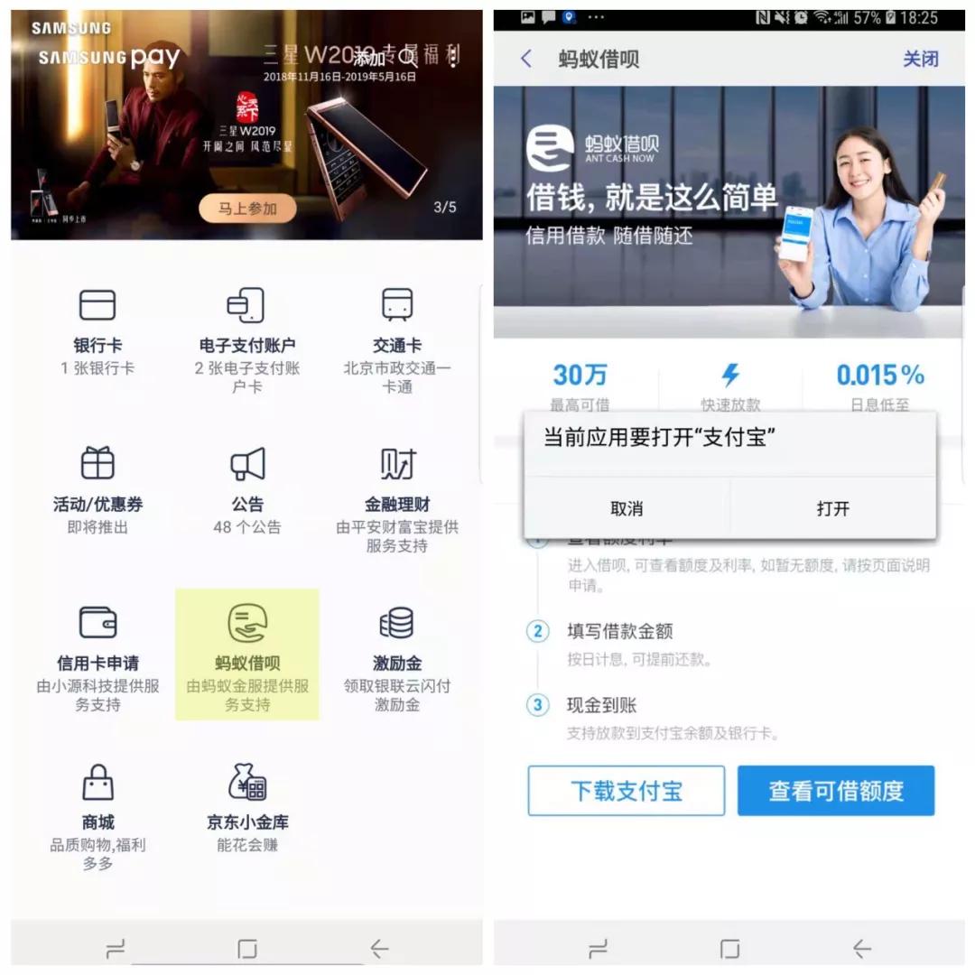 无独有偶,在三星手机sumsang pay里,“蚂蚁借呗”直接出现在了首页位置。点击后,系统提示会直接跳转到支付宝。