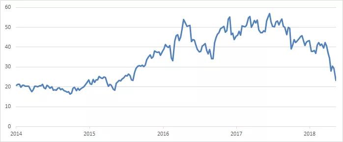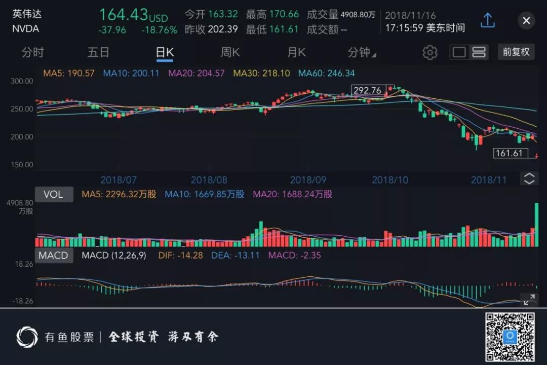 在过去的一个多月,作为美股市场上最耀眼的人工智能概念股——英伟达(NVDA),股价连续下跌,从2018年10月1日的最高292.76美金,下跌到最低2018年11月16日的最低161.61美金,股价回撤幅度近45%。