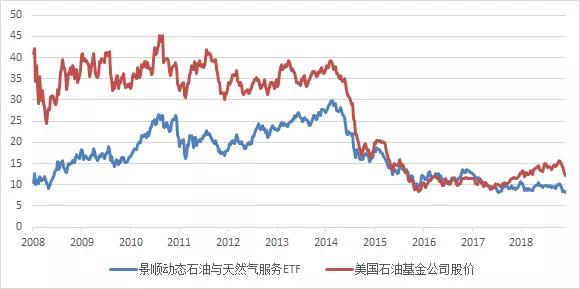 同样的情况,我们也可以在油服行业和原油的关系中获得借鉴。原油价格自从2008年后持续下跌,虽然在2016年触底反弹,但是初期过剩的油服产能,并没有因为油价的复苏有所改善。以油服行业ETF为例和美国石油ETF作比较也可以看出,油价的波动和反弹并不改变油服的持续衰退。
