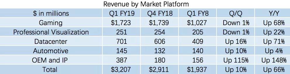 那么英伟达的GPU呢?从业绩拆分上来看,英伟达零售GPU的销售收入主要划分到游戏收入领域,2017整个火热的数字货币行情,带动了挖矿市场的蓬勃发展。从季度收入增长上也可以看出,2019财年的一季度的游戏业务增长,相比2018财年一季度游戏业务同比增长近68%。